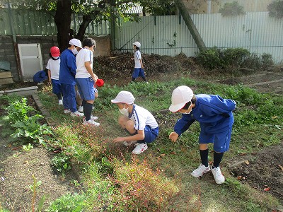 2校時の生活は、『秋みつけ』です。久しぶりに花壇とビートープに行くと、木々の葉がすっかり『秋』になっていました。