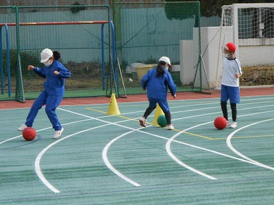 まずはドリブル練習です。ボールをけりながら、コースからはみでないようにコートを一周します。なかなか難しい練習ですが、自分の走るスピードとボールをける強さのバランスを調整することがポイントでした。