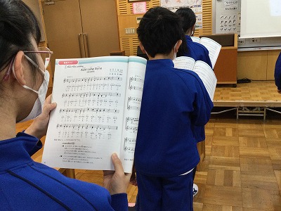 先週の英語の始めに、ポール先生から英語版「ほたるの光」を歌っていただきました。5年生の教科書にも載っているスコットランド民謡「ほたるの光♪」を聞いて口ずさんでみたり、日本語の歌詞で歌ったりしました。