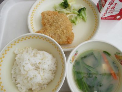 今日の献立は「とんかつ、キャベツのサラダ、壬生菜のみそ汁」でした。