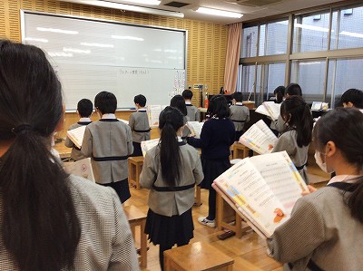 伸びやかな声で聖歌「四弘誓願」「法然上人頌」を歌唱した後は、リコーダー二重奏の準備学習を行いました。