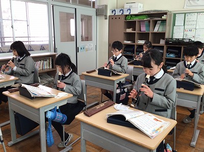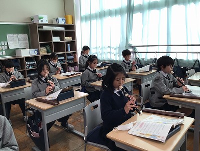 教室では、早速リコーダーの練習です。「ソーファ/ミーミ/レレラ/ソーソ」の2段目に、“ソより低い音”が登場します。ここをポイントに個人練習を行いました。