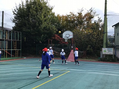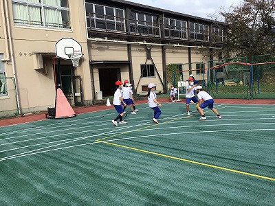 バスケットボールの学習が始まっています。この前から「3×3」のルールを教わり、赤白の対戦を通して、「3×3」のルールを身につけています。