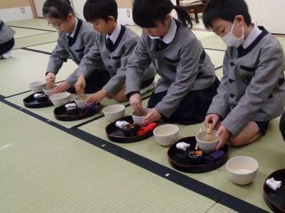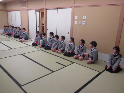 今日の礼法は、中学高等学校の作法室で「ありがとう茶会」のリハーサルです。