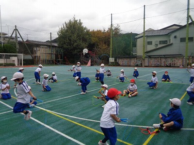 縄跳びは、まず前回りを跳ぶ練習です。体力作りのためにも、前跳びをできるだけたくさん跳べるように活動しました。