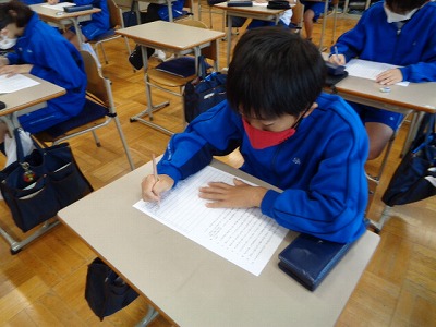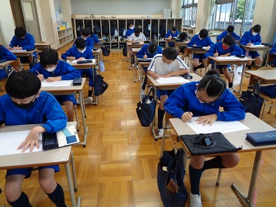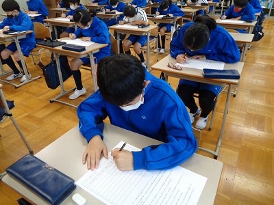 週末の漢字大会に向けて、5問ずつの小テストを朝根っこタイムに実施します。