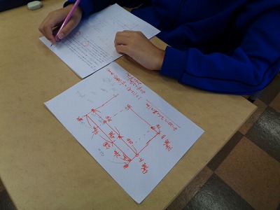 玉井先生に書いてもらった線分図を見ながら、「速さ」の問題を熱心に考える姿が見られました。