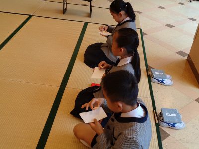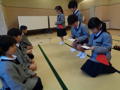 後半は、一年生の時に学習した帛紗さばきを集中して練習し、しっかりと身に付けようと頑張っていました。