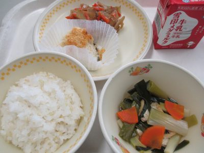 今日の献立は「さわらのパン粉焼き、きんぴら、ねぎの煮物」でした。