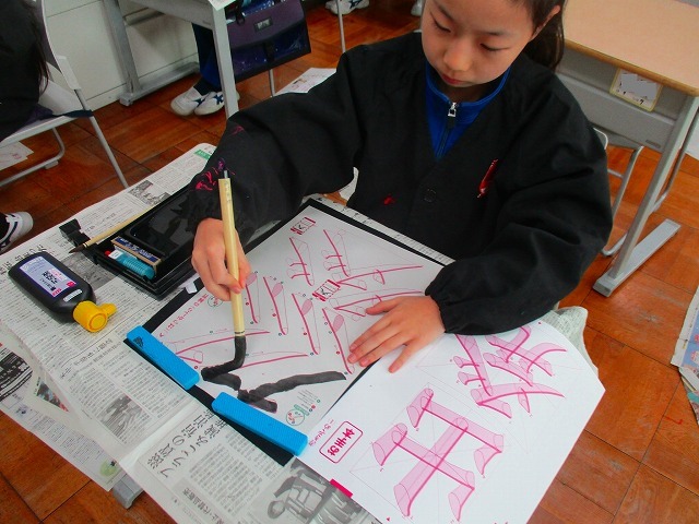 どちらの字も難しくて何回も書き直しながら、練習する4年生。