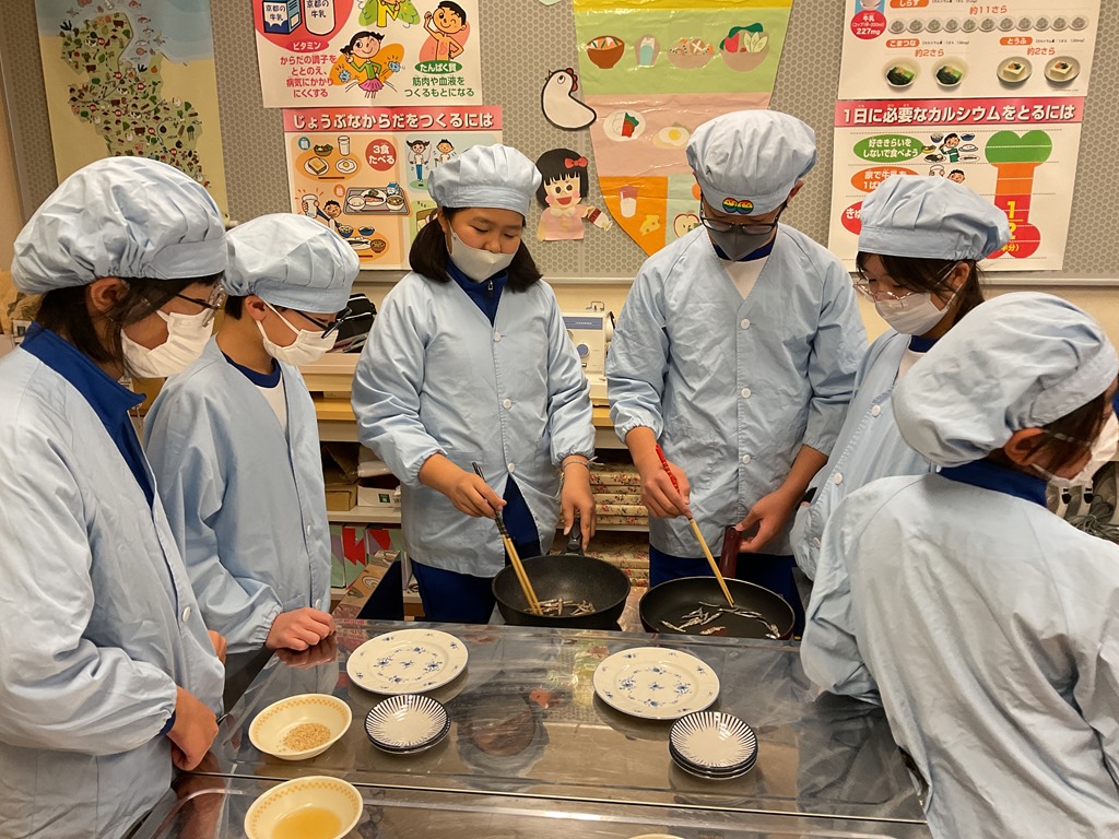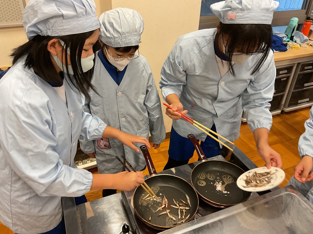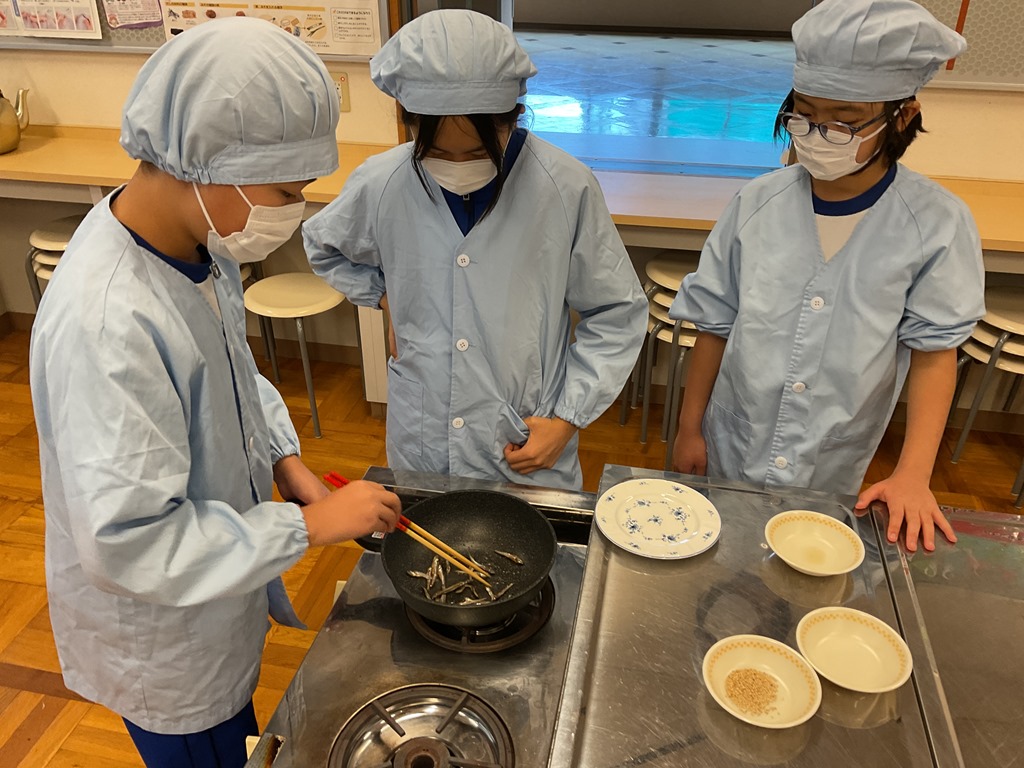 ごまめは、火加減に大苦戦!フライパンの温度が上がりすぎて、調味料がこげてしまい、再チェレンジする班もありました。