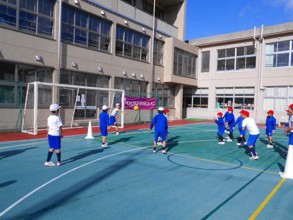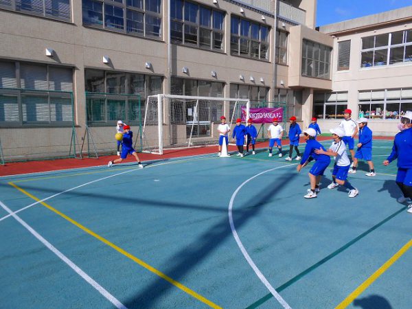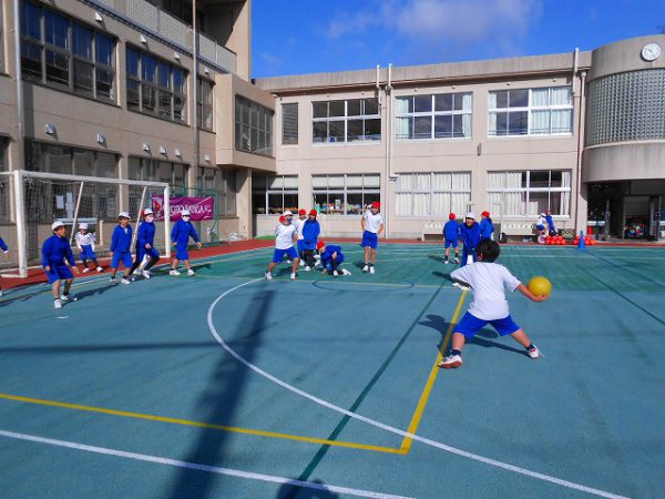 とてもいいお天気の中間休み、ドッジボールに熱中している5年生です。