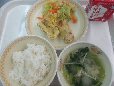 カレー粉の黄色と青のりの緑が入って、二色の天ぷらになりました。1年生に二色の色を尋ねると、「三色ある!」と竹輪についた茶色い焦げ目にも気づいて声を出してくれた人がいました。今日は竹輪の切り方を変えて、天ぷらにしました。