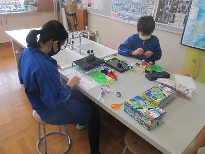 最後に、鉄芯を入れたコイルと、入れていないコイルに、乾電池で電気を流して、その磁力を確かめました。