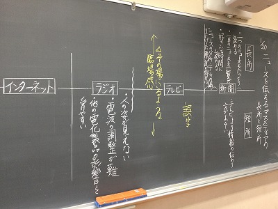 「想像力のスイッチを入れよう」の学習では、情報を受け取る私たちに、多くの課題が求められています。今日は、代表的なマスメディアを掲げ、その長短両面を考える活動に取り組みました。