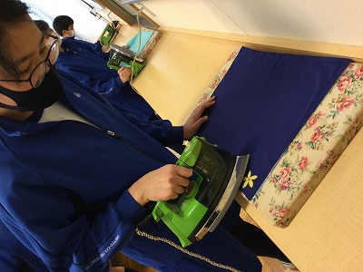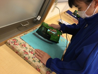 アイロンの役割には、「しわをのばす」ほかに「アイロンシール」と「折り目をくっきりと付けて縫いやすくする」という三つの仕事があることを学習できました。