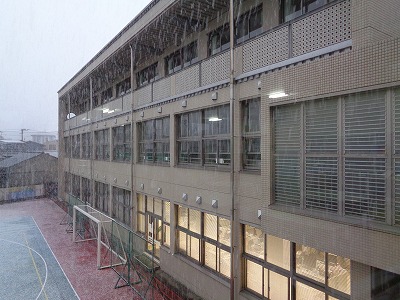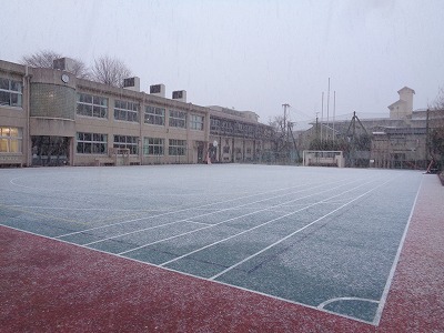 子ども達が下校して、1時間半がたったでしょうか。午後5時の運動場です。うっすら雪化粧をしています。明日の朝は真っ白かもしれませんね。
