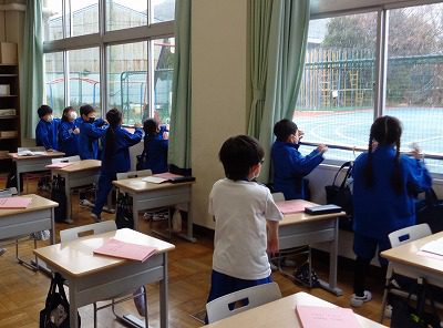 朝根っこマラソンで始まった今朝は、雪が少しちらつくこともありました。寒い運動場と思っていたら、校舎に近づくと寒さが少しましに!