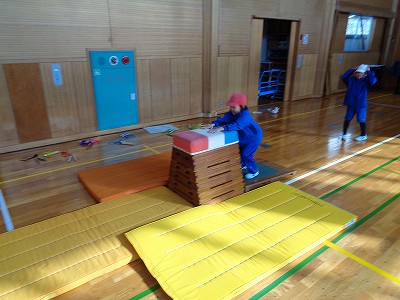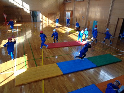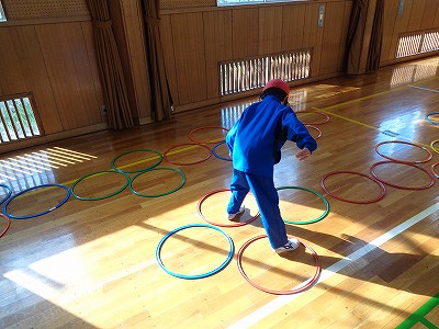 「マット、ケンパ、跳び箱、バスケット、なわとび」のエリアを順番に取り組む学習です。