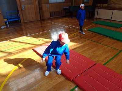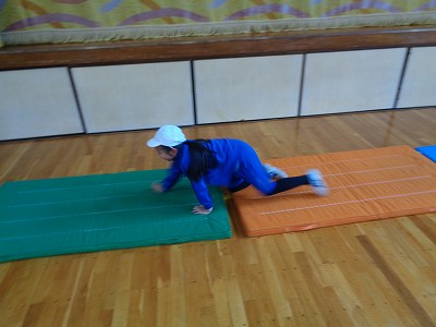 マットエリアでは、前転、後転、丸太、川跳び、ブリッジなど様々な技にチャレンジしました。