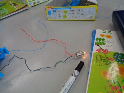前回までに組み立てていたものを使い、導線をつなぐと明かりがつきました。