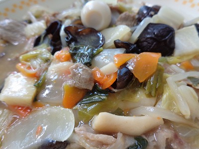 玉ねぎや白菜、もやし、チンゲン菜など、いろいろな種類の野菜を使いました。