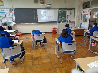昼根っこタイムは、2学期から取り組んでいる『思考力ドリル』に取り組みました。今日は「説明力」を鍛える学習です。葛飾北斎の富嶽三十六景の絵を見て、その絵について説明していきます。絵の中の大きな波を言葉で表現するにあたって、「はげしい波」「そり立つ波」「高い波」など、いろいろな言葉の表現が出てきましたが、そのどれを使用すれば、絵の迫力や細かさが伝わるのかをみんなで確かめていきました。