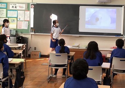 火曜日の朝の会では、NEWS係さんが朝のニュースを伝えてくれます。最近の社会のニュースや、コロナウイルスの感染者情報、天気予報などを毎朝調べ、みんなに紹介してくれています。