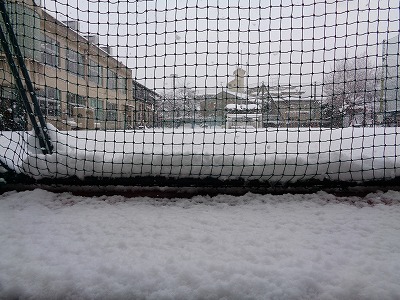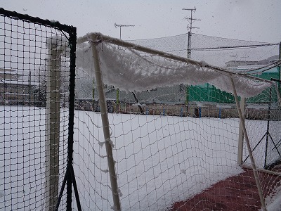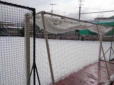サッカーゴールのネットに雪が垂れ下がっています。興味深いことに、ちょうどその下は積もっていませんでした。