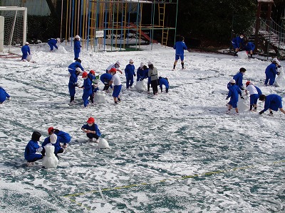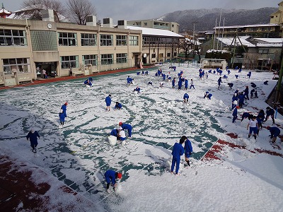 みんなと共に力を合わせた作品です。6年生は1m50cmくらいの雪だるまを作っていました。