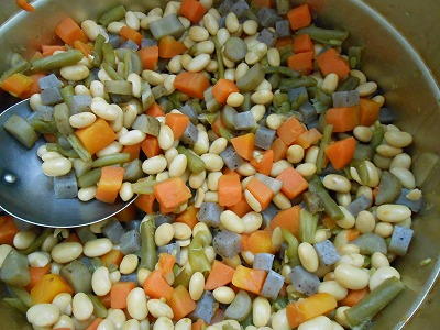 五目豆は、大豆の大きさに合わせて、ほかの具材をさいの目に切るようにしています。