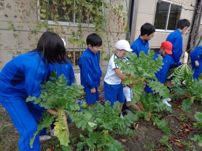 「朝根っこタイム」の時間に、6年生と大根引きをしました。