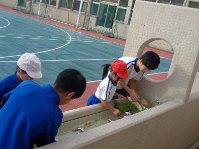 6年生にサポートしてもらいながら収穫して、その後、水で洗いました。