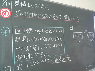 小数のかけ算やわり算の単元が終了し、小単元の「見積もりを使って」について取り組みました。日常の生活の中で、長さを計算したり、時間を計算する際、どんな式を立てて、どんな計算をすればよいのかを実際に計算します。