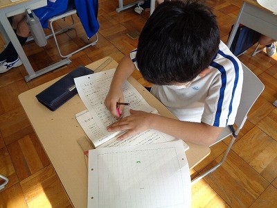 4時間目の国語は、「プラタナスの木」最後の授業です。今日は、これまでのプラタナスの木についての学習をふまえ、切り株になったプラタナスの木が、この後どうなってしまうのかを予想し、お話を書く活動を行いました。登場人物の性格や、このお話の流れが分かっていなければ、なかなか書き進める事ができません。自分のノートや、教科書の本文とにらめっこをしながら、それぞれにお話を考えました。