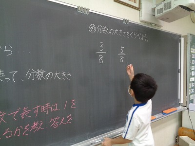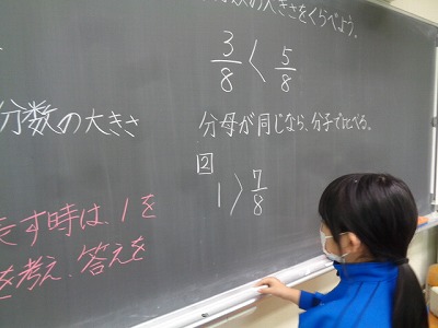 大小の式に表す活動では、不等号や等号の意味を確認し、分数の大きさ比べを行いました。