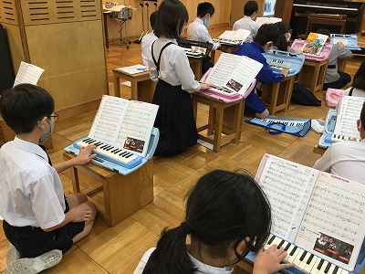 まずは、音楽室で低音パートの“エア練習”です。その前に「ドレミ」で歌う練習を行いました。歌唱だけでもハーモニーが響くように、みんなの歌声が広がります。