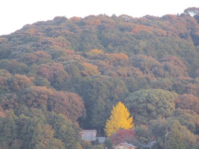 There is a brilliant yellow ginkgo tree in the middle of the mountain that we can see at shoji shrine.