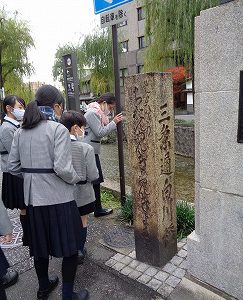 学校付近は、風情ある昔ながらの町並みが残ります。まず「坂本龍馬・結婚式の地」を確認しました。