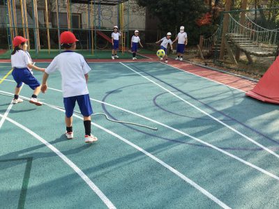 遠くに蹴られたボールを、みんなで「追いかけろ~」