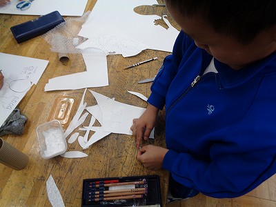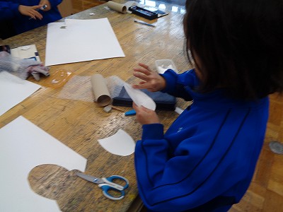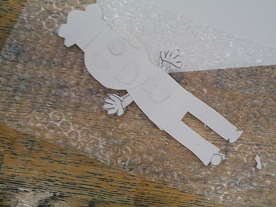 そのイメージを元に、画用紙、プチプチ、波段ボールなどの材料を使って仕上げていきます。