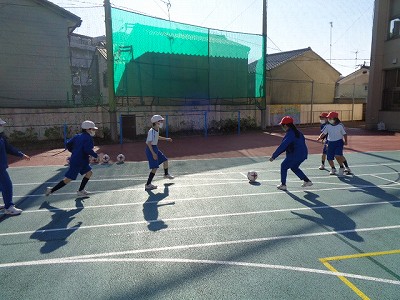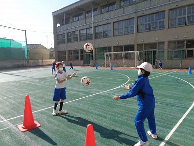 いよいよ4時間目、3年生のサッカー教室の時間です。コーチの説明を聞いて、色々な運動をしました。