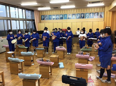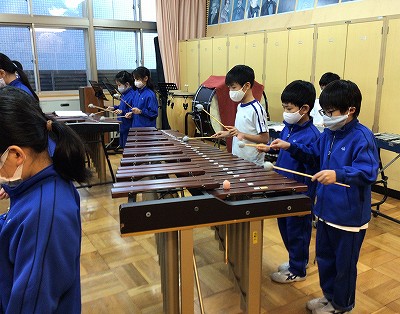 音楽室では、低音パートを「木琴・鉄琴」が担当し、リズム楽器と歌唱での合奏を行いました。