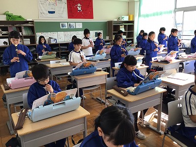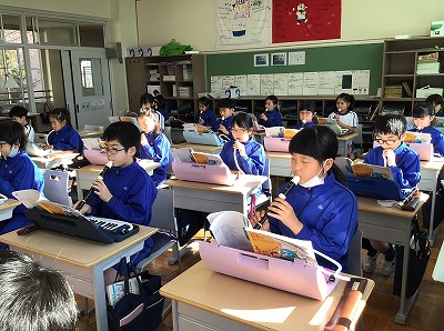 教室では、リコーダー二重奏と鍵ハモ奏の合奏です。このアレンジは、互いの演奏スタートが違っているので、呼吸を合わせることが難しい合奏です。前の時間には、拍が合わなくて、すっきりしない終わり方の時がありました。その点を改善しようと、別のパートのオルガン奏を聞きながら、リコーダー奏・鍵ハモ奏を行う練習を繰り返しました。少し速めのテンポにもチャレンジし、手応え上々で、仕上げの合奏です。