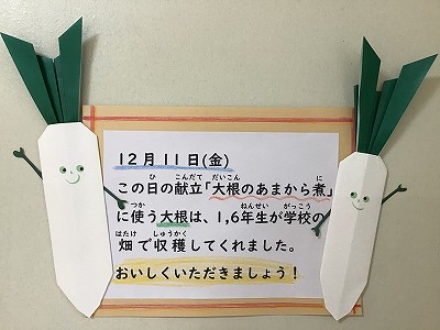 冬になっても、収穫の掲示が続きます。それは今週の火曜日に1,6年生が収穫したダイコン!早速、今日の給食で頂いたダイコンが主役です!