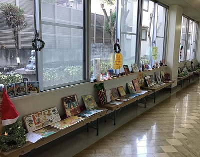 In the hallway there are many Christmas books on display that the students can look at and practice their English reading skills.