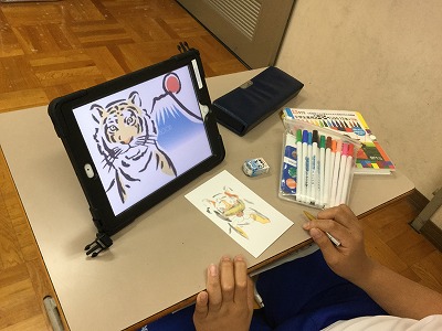 版画チックに描いたり、漫画タッチで描いたり…思い思いの年賀状が仕上がっています。