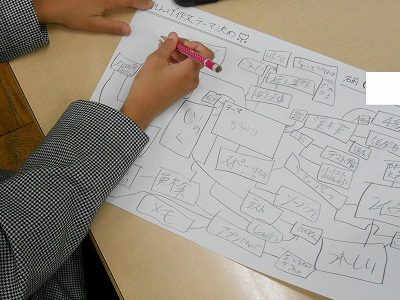 「がんばり」や「友情」などのテーマから、一つを選び、白い紙に考えを書き出します。思いつく事をたくさん書き出して、作文の材料としてヒントにしていきます。