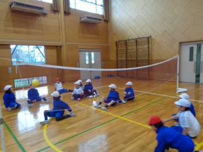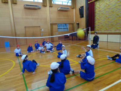 2学期に入って行ったパラリンピックの学習に関連して、足の不自由な人が取り組むスポーツ「シッティング・バレー」をしました。おしりをつけたまま、バレーをします。