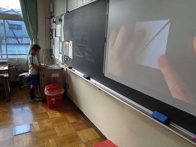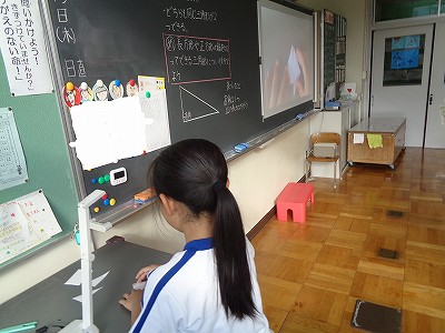 まずは、長方形と正方形の紙を切ってできる三角形について、気付いたことを発表しました。